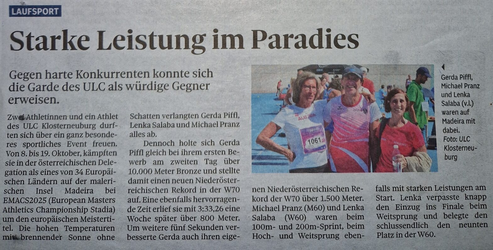 Gerda Piffl holt bei den Europameisterschaften der Masters die Bronze Medaille über 10.000m. Neben ihr waren auch Michael Pranz und Lenka Salaba Teil der österreichischen Delegation. Alle drei erreichten sehr starke Leistungen und vertraten den ULC Klosterneuburg sehr würdig.