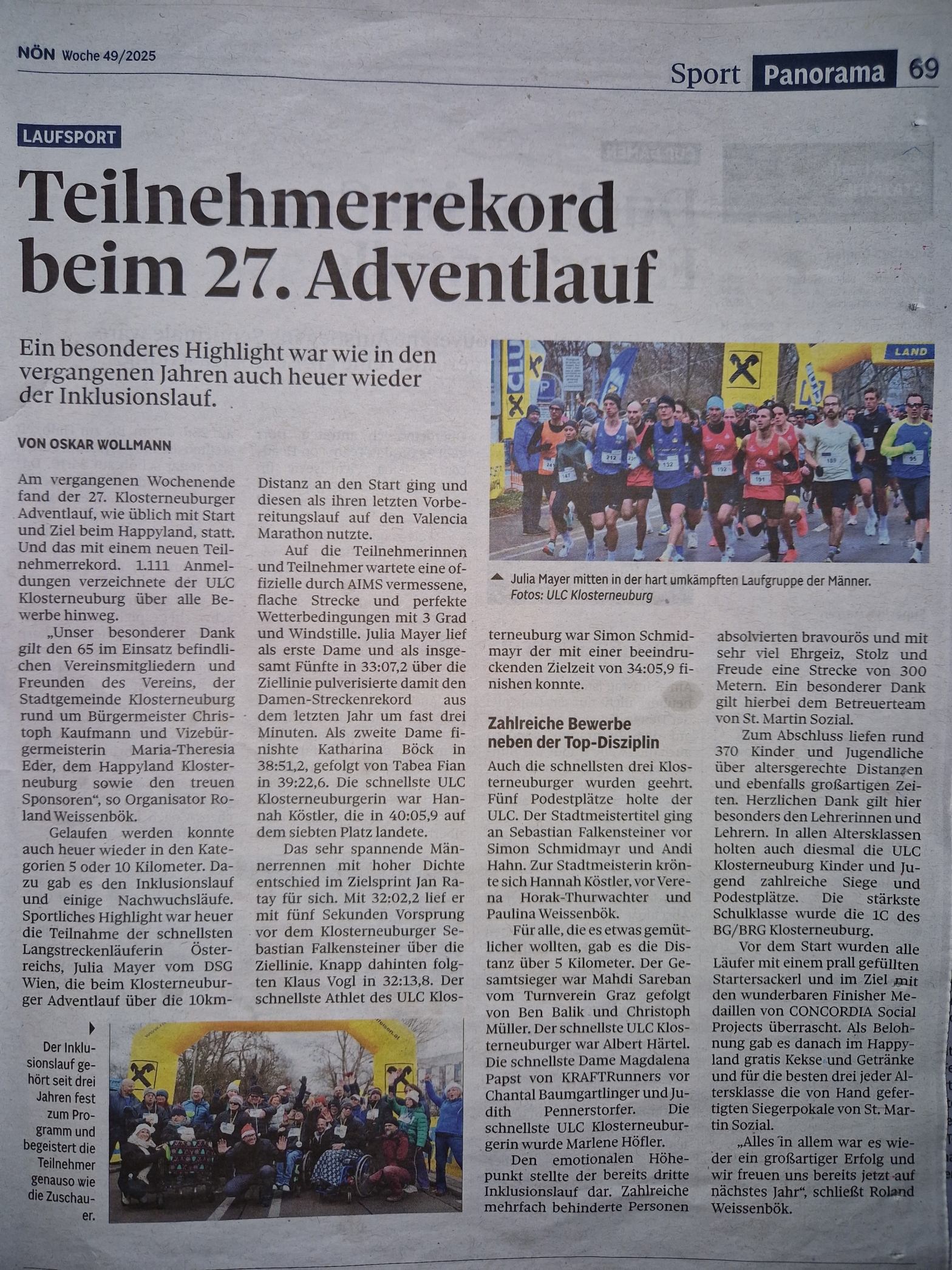 NÖN 49/2025: Teilnehmerrekord beim 27. Adventlauf – Sebastian Falkensteiner und Hannah Köstler werden Klosterneuburger Stadtmeister